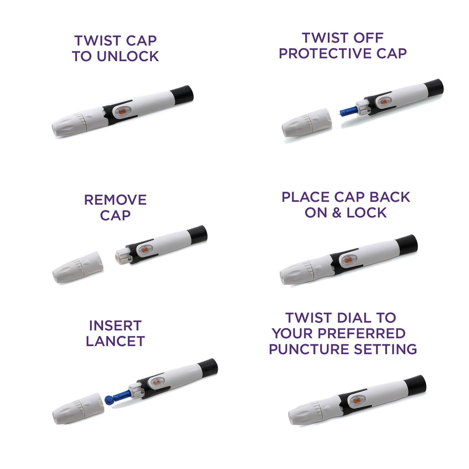 MD6 lancets are built sturdy and work the first time to avoid the need for repeat sample attempts. and won't cause damage to the fingers like older style lancets. They're guaranteed sterile and the protective twist cap is designed to cover the lancet when you're done for safe disposal. Bruno lancets use less blood and are small enough to carry in the pouch with your glucose meter for daytime testing.
